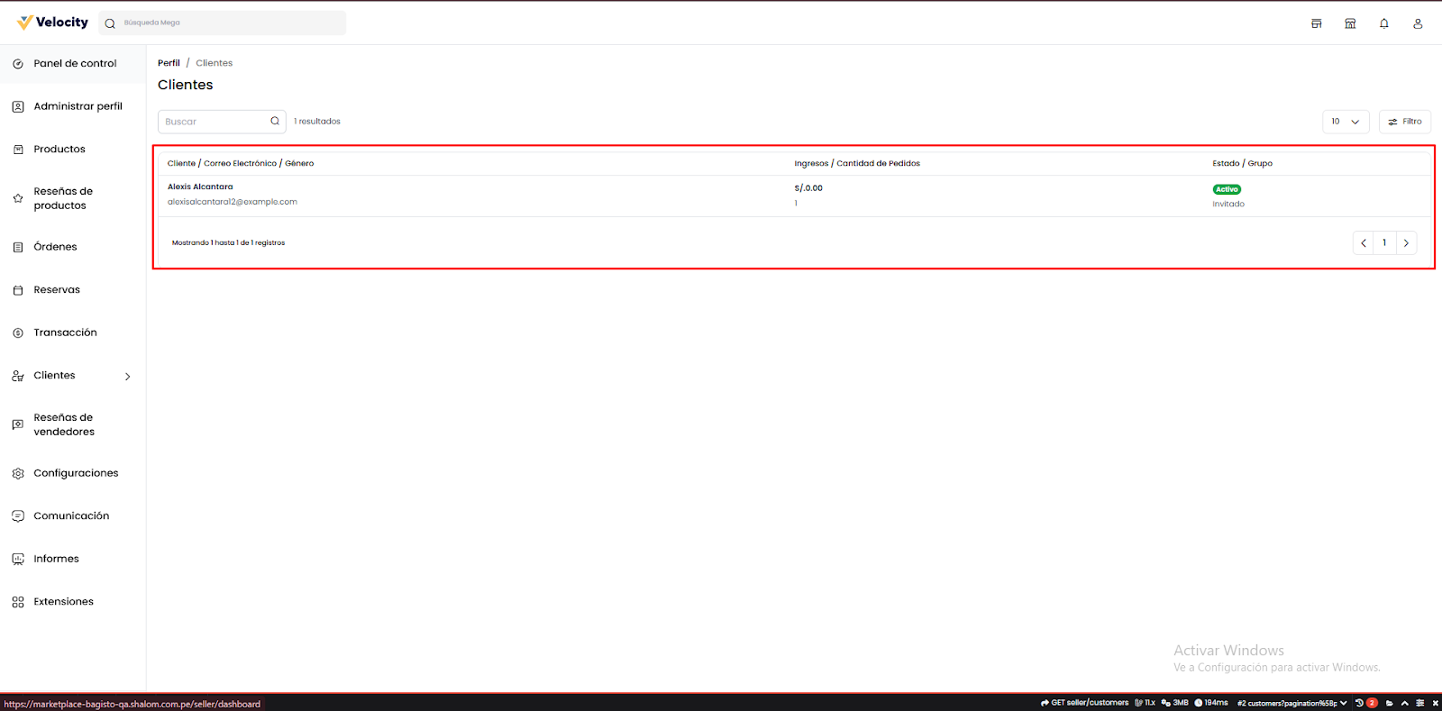 Nos redirigimos al apartado del vendedor y podemos visualizar el cliente nuevo que se registro