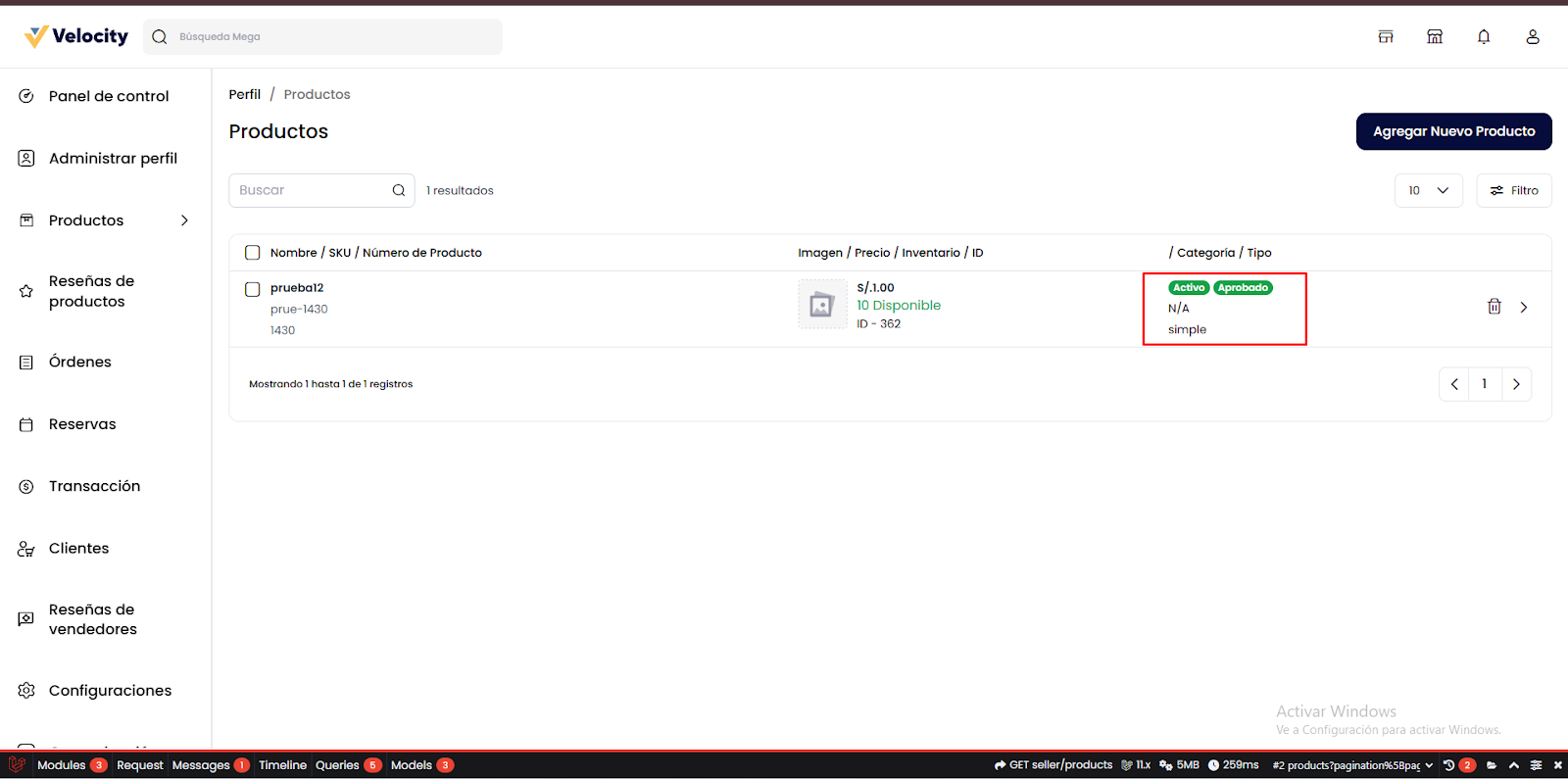 Creamos un producto ya que es un vendedor nuevo y lo verificaremos con el apartado de cliente