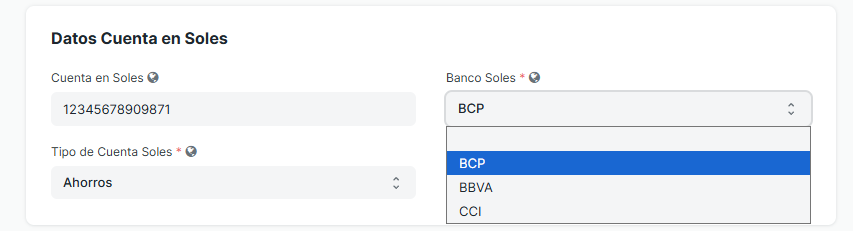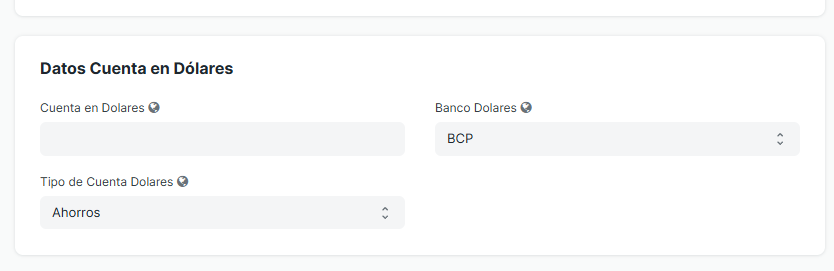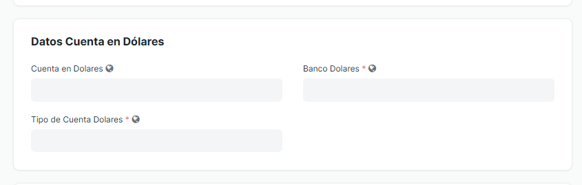 Regla de Dependencia: Si se ingresa un valor en el campo "Cuenta en Dólares", los campos "Banco Dólares" y "Tipo de Cuenta Dólares" pasan a ser Obligatorios.