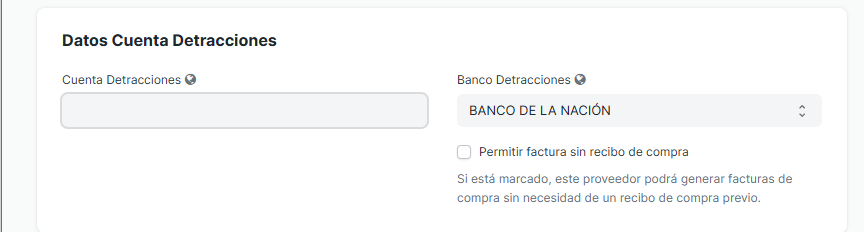 Esta sección es exclusiva para proveedores con Origen: Nacional. Si el origen es Internacional, esta sección permanece oculta.