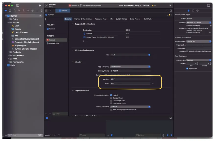 - Build → aumentar en +1 respecto al último publicado. ⚠️ Importante: corroborar con la versión actual en el App Store para no repetir números.