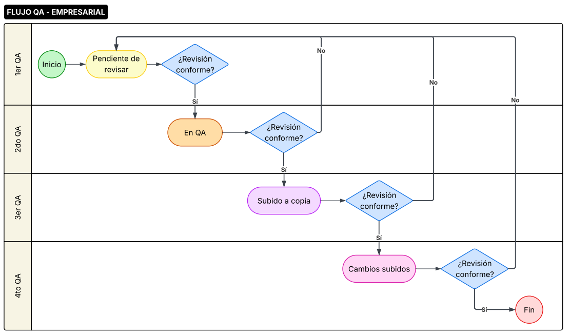 Establecer el flujo de revisión y control de calidad (QA) de las tareas, asegurando que cumplan con los criterios definidos antes de su aprobación final, mediante revisiones secuenciales que permitan detectar, corregir y validar observaciones de forma oportuna.
