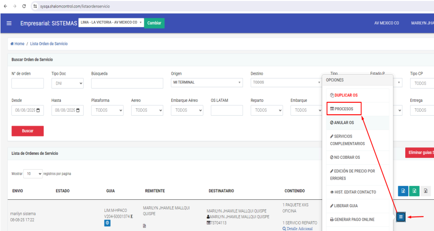 En el sistema de empresarial Generales => Lista Orden de Servicio=> Menú =>Procesos.