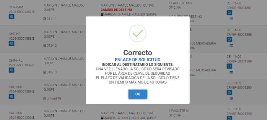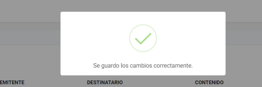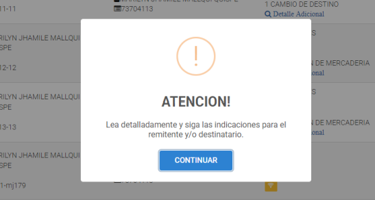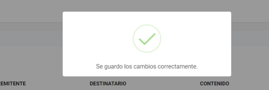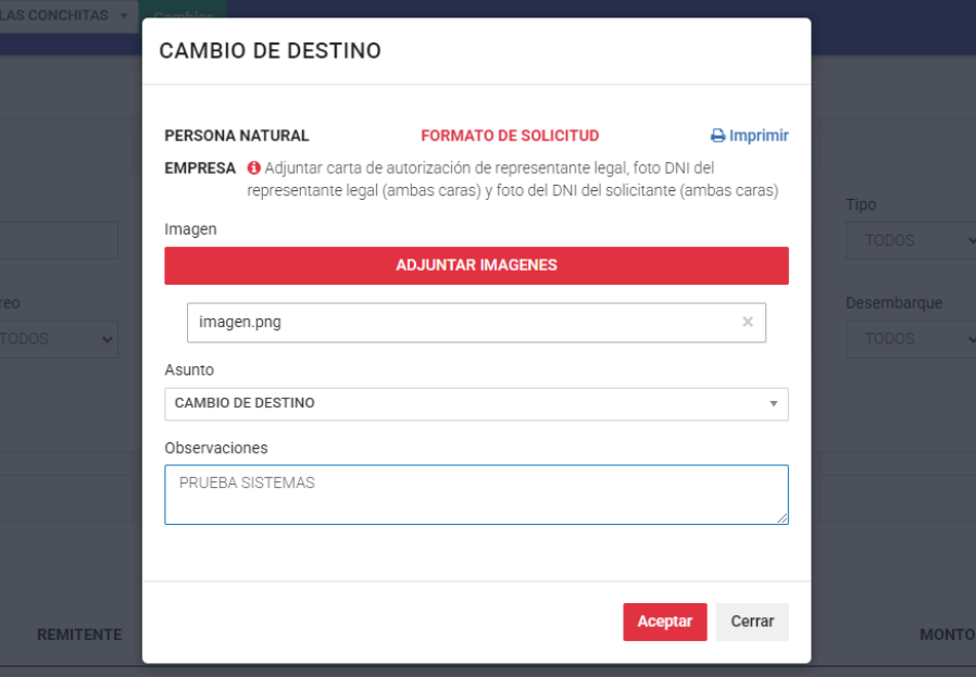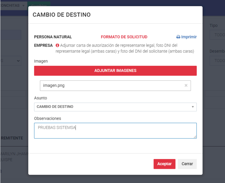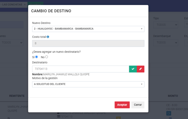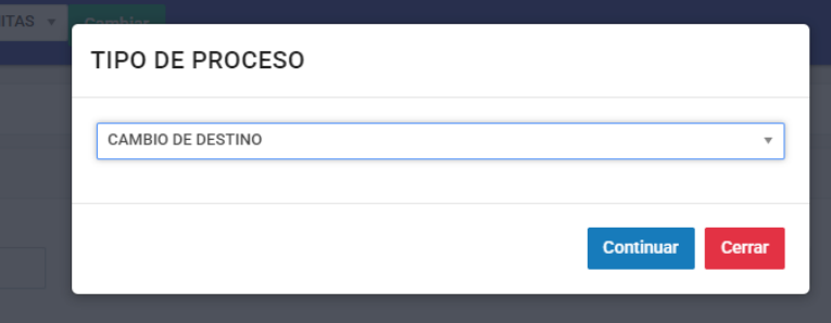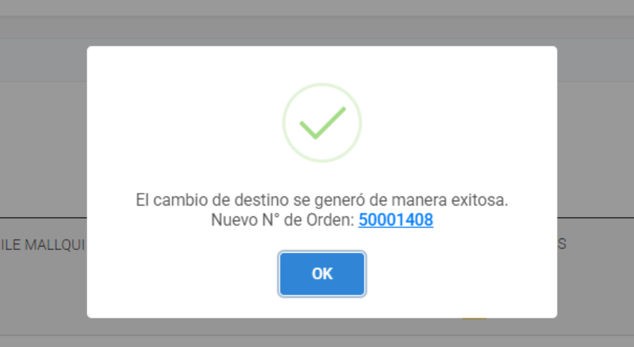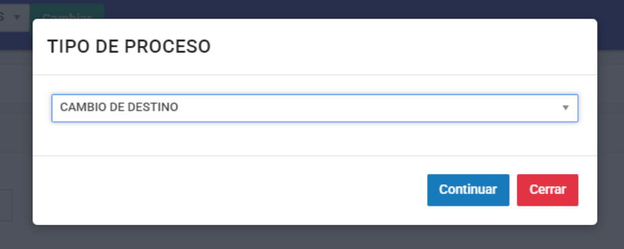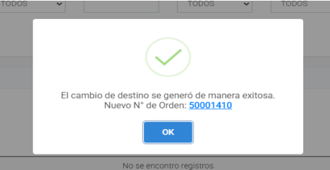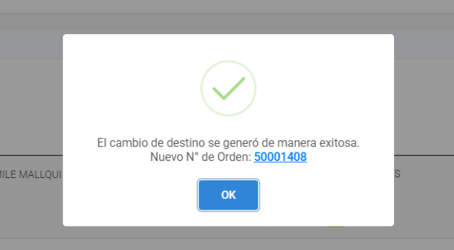 Se visualiza lo siguiente cuando se realiza un proceso de cambio de destino.