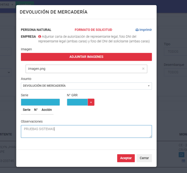 Seleccionamos el nuevo destino y en este caso nos pedirá agregar una serie y grr previamente creada con la guía.