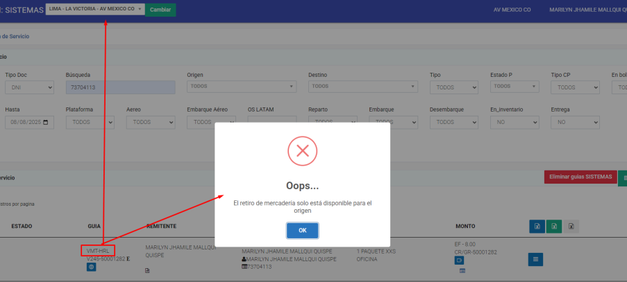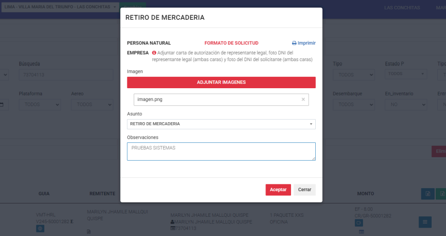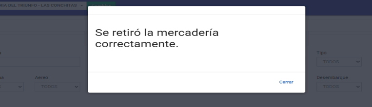 Se visualiza lo siguiente cuando se realiza un proceso de retiro de mercadería.
