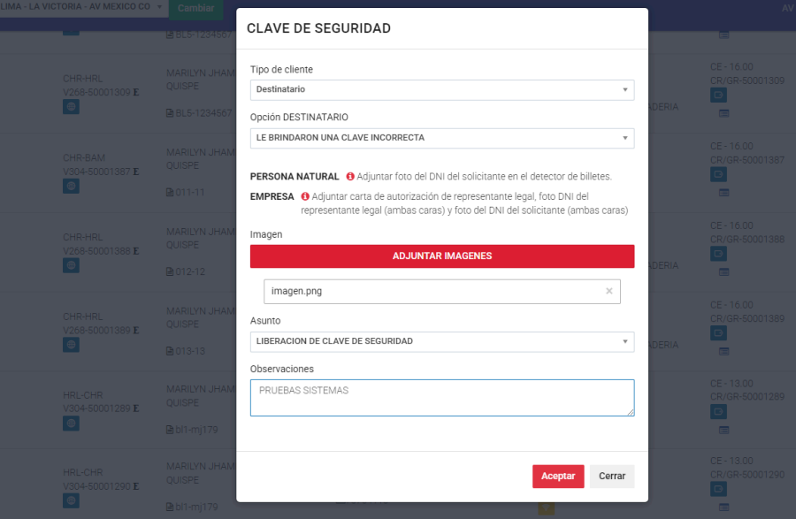 - Validación de Procesos: Se valida mediante la contraseña del usuario que hará el proceso, esto dependerá del tipo de proceso seleccionado.