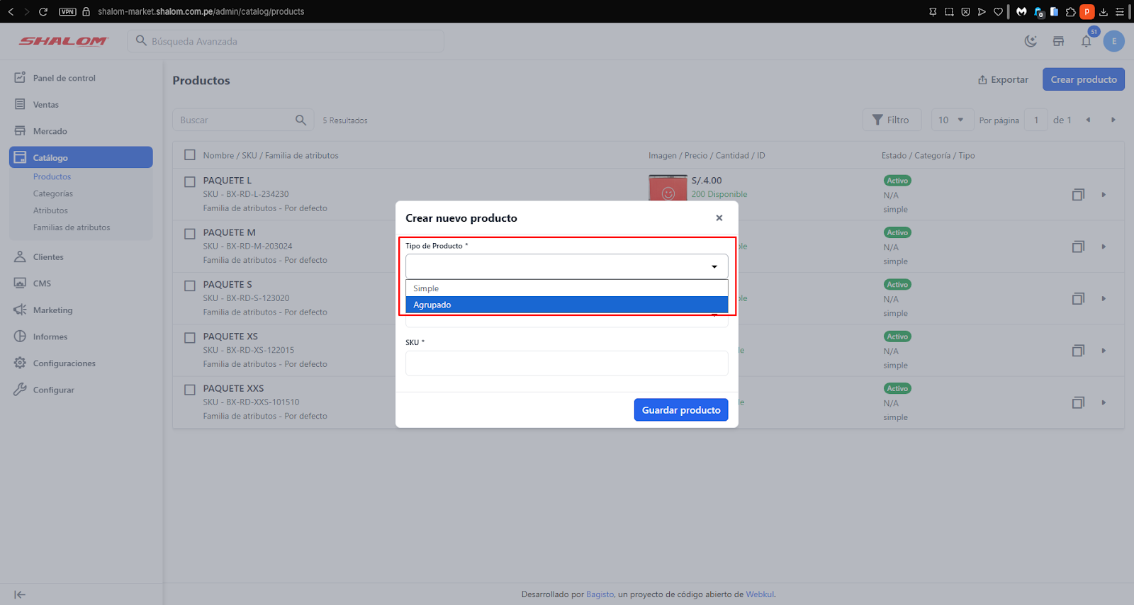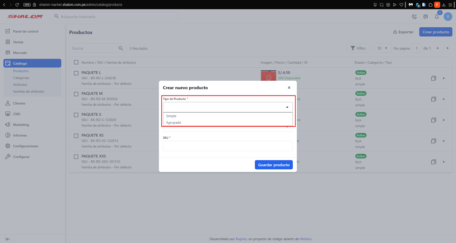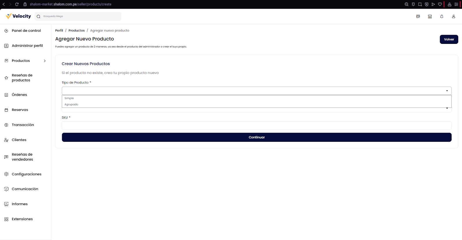 Se crea un “Tipo de producto” en este caso “Simple”, campo obligatorio.
