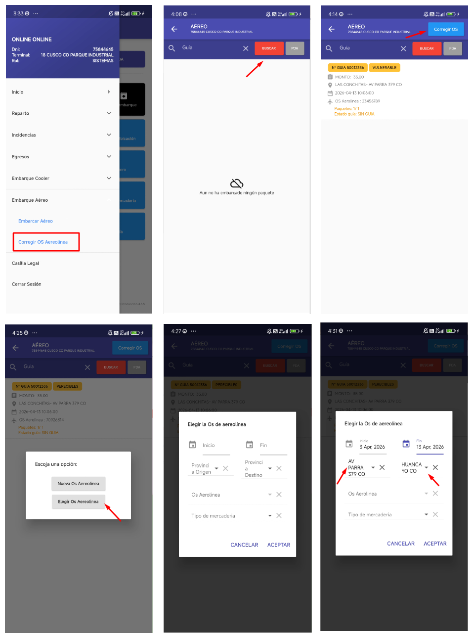 - Módulo Corregir OS Aerolinea → Vista Aereo