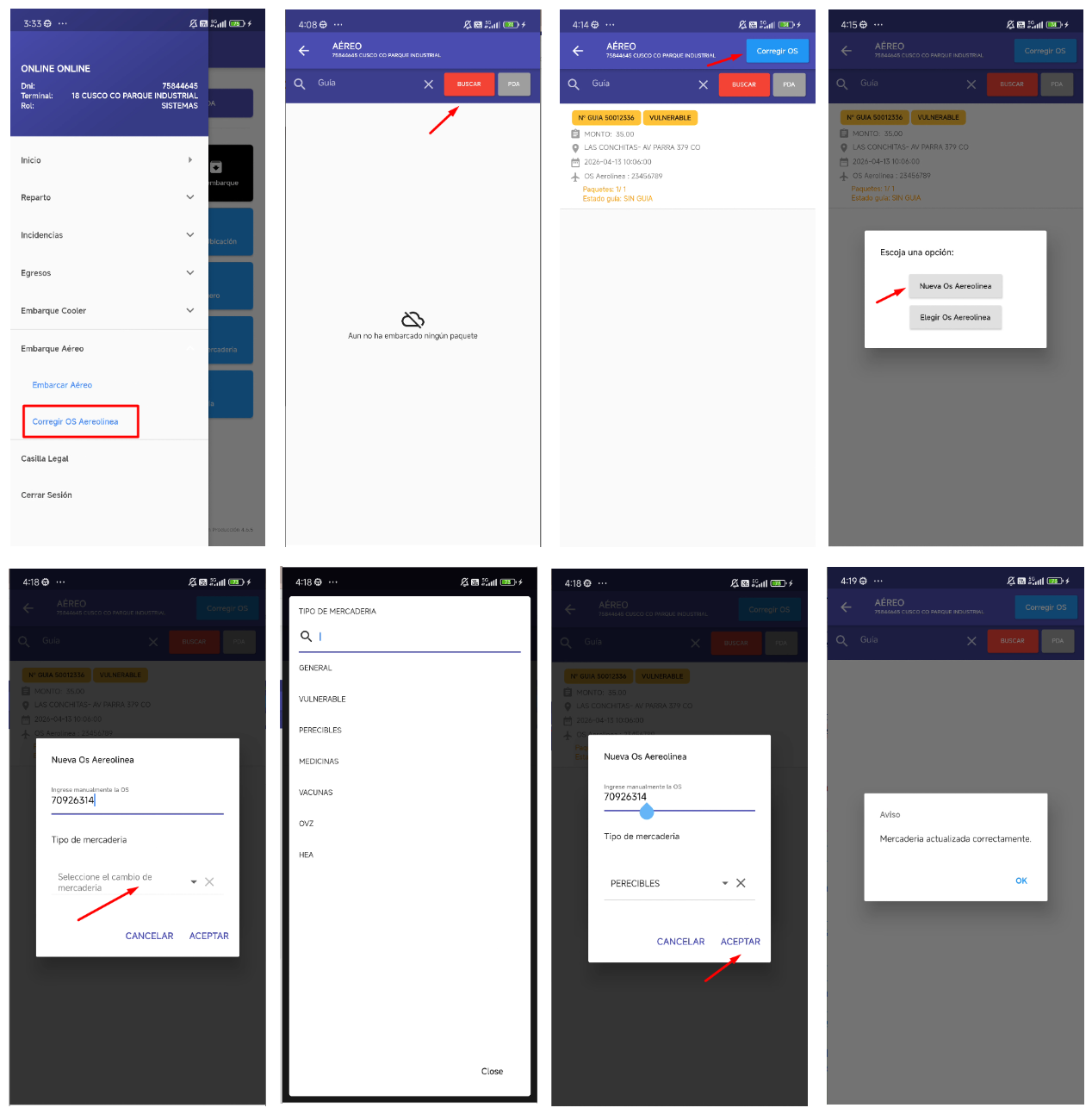 - Módulo Corregir OS Aerolinea → Vista Aereo