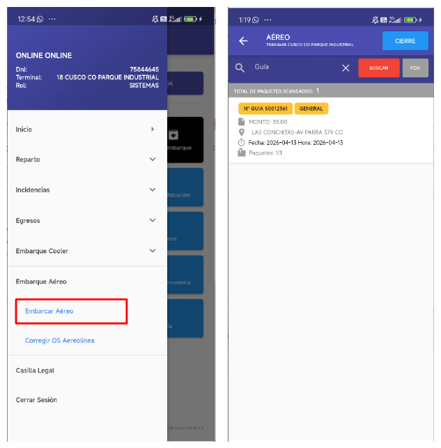 - Módulo Embarque Aereo (opcion 2) → Vista Aereo