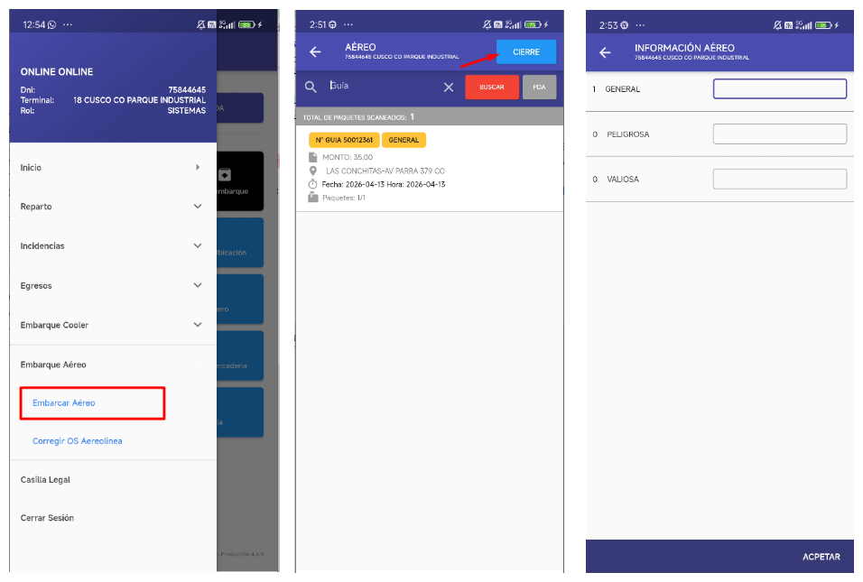 - Módulo Embarque Aereo (opcion 2) → Vista Aereo