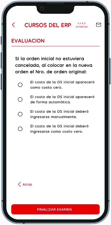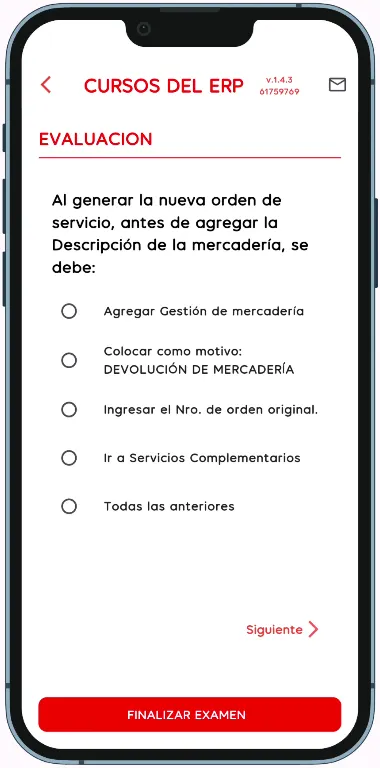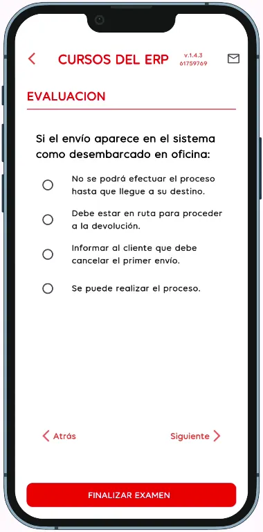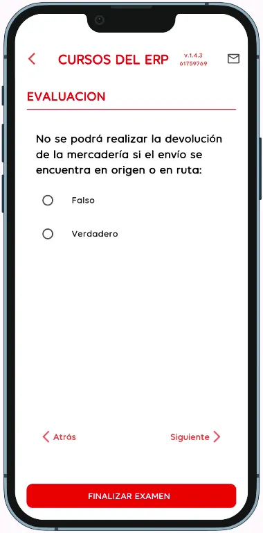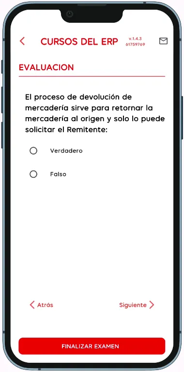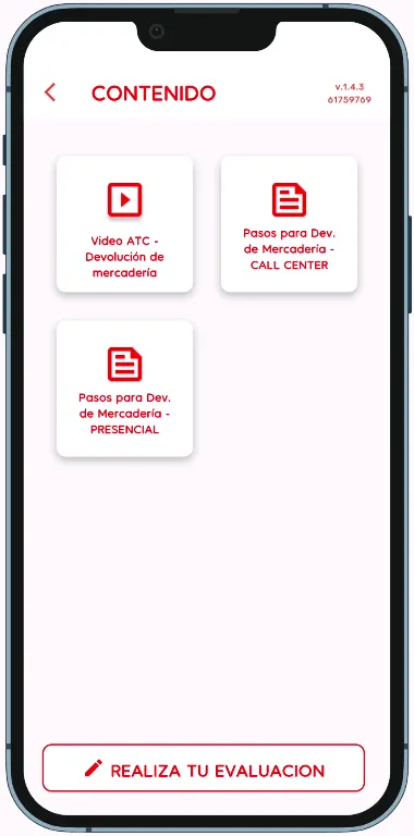 - ¿Cuándo se usa? Al ingresar a la opción “Cursos”, luego “CAPACITACIÓN ATC (II FASE)”, luego “DIA 2 - Devolución de mercadería” y presionas el boton “Realiza tu evaluación”.