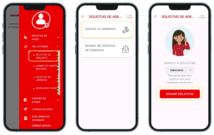 - ¿Cuándo se usa? Al ingresar a la opción “Solicitud de adelanto”, luego al boton “Solicite un adelanto” y al boton “Enviar Solicitud”.