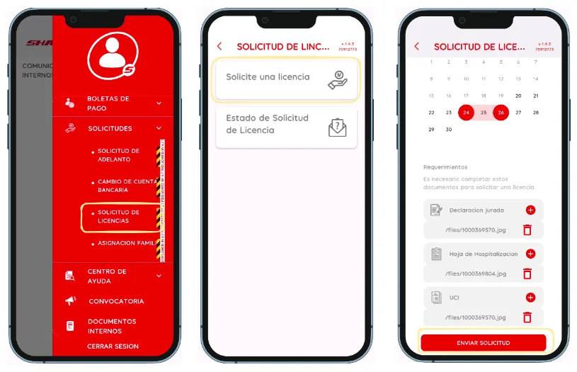 - ¿Cuándo se usa? Al ingresar a la opción “Solicitud de licencias” y al botón “Solicite una licencia” y al boton “Enviar Solicitud”.