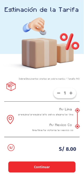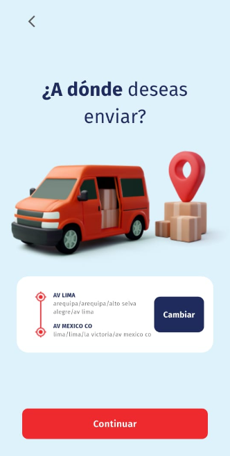 Luego de elegir el producto deseado a enviar, nos saldrá el apartado de selección de origen y destino, además de esto tambien podemos cambiar la dirección de envio