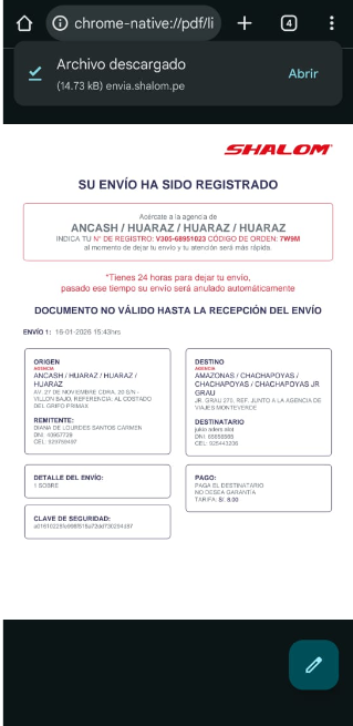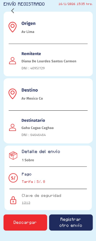 Luego para guardar nuestros datos de registro, podemos descargar la guia o realizar otro envío, pero es preferible descargarlo, ya que despues no se puede ver el numero de guia, solo se buscaria por el número de DNI.