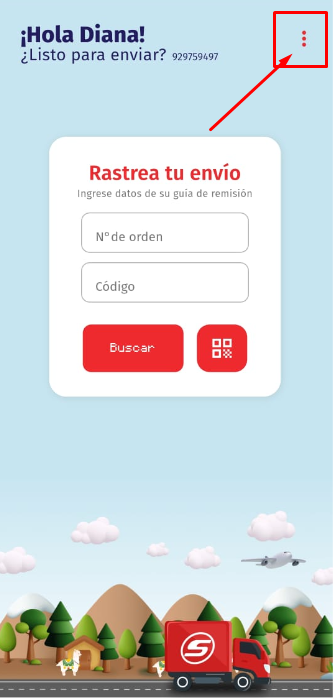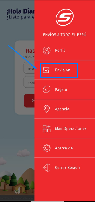 Primero ingresamos al app de Shalom, luego a los 3 puntitos e ingresamos al apartado de "Envía ya".