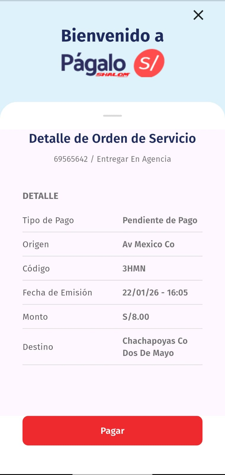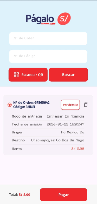 Lo primero que nos saldra cuando ingresemos al apartado de Págalo, sera este menú, donde nos piden el número de guia OS y tambien el codigo que se nos brindo en el aplicativo