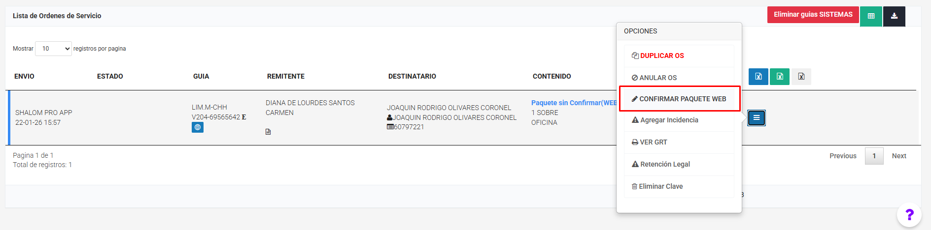 Por lo tanto Procedemos a confirmar el paquete desde el apartado del empresarial