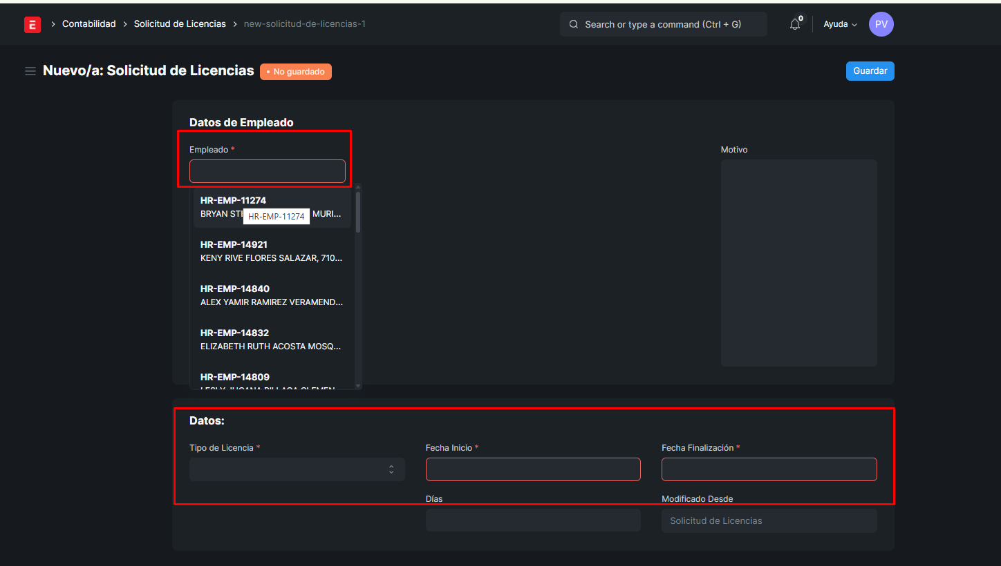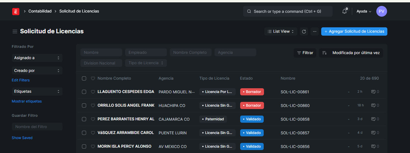 PODREMOS VER TODOS ESTOS REGISTROS EN LA SOLICITUD DE LICENCIA EN EL ERP (ir a solicitud de licencia)