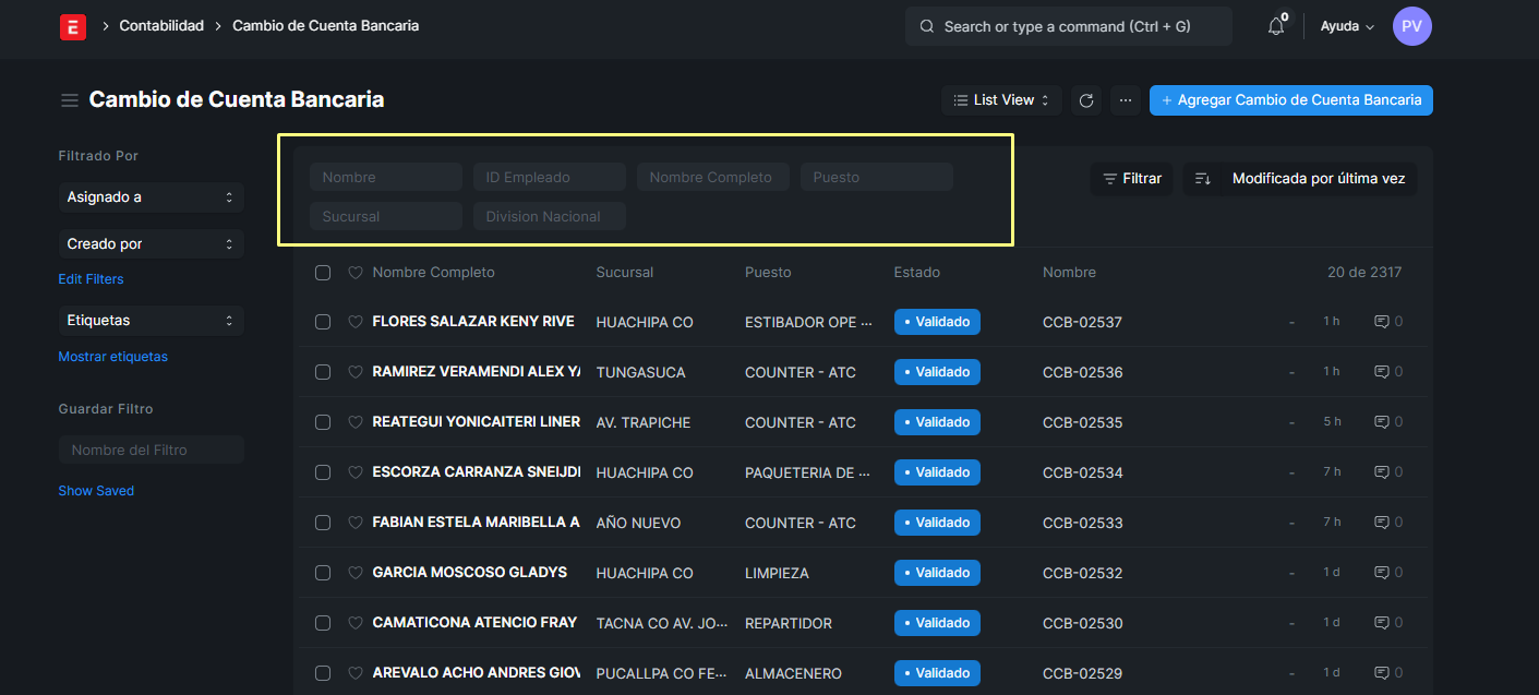 PODREMOS VERIFICAR LA SOLICITUD EN EL APARTADO DEL ERP DE CAMBIO DE CUENTA BANCARIA (ir a cambio de cuenta bancaria)