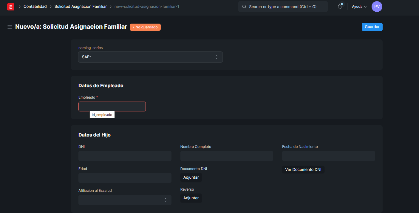 INGRESAMOS A LA ASIGNACION FAMILIAR Y RELLENAMOS LOS DATOS QUE NOS PIDEN, ESTO SE SUBIRA EN EL APARTADO DE ERP DEL EMPLEADO DE LA ASIGNACION FAMILIAR. (ir asignacion familiar)