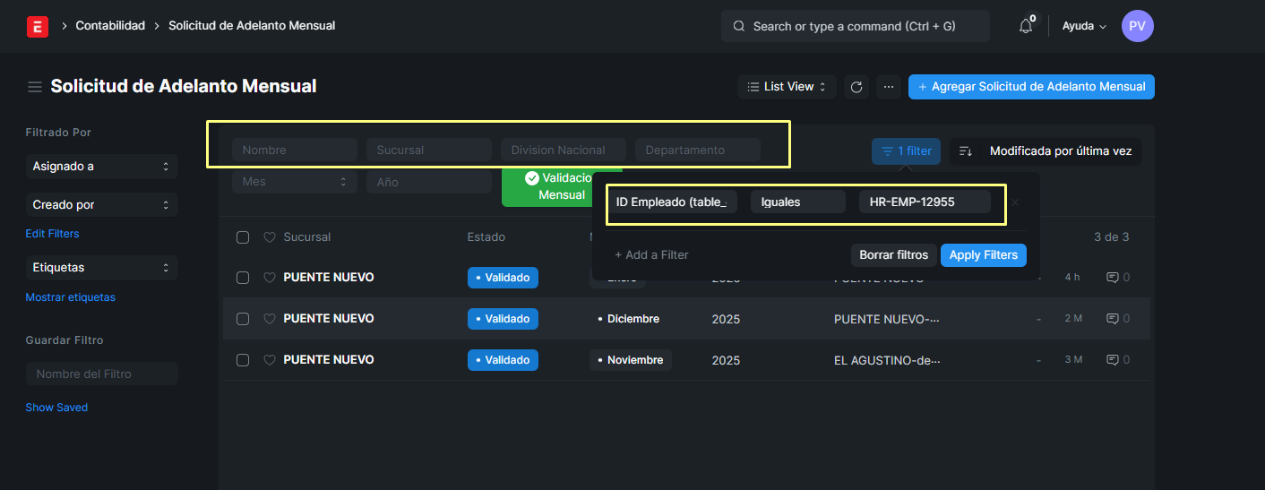 TAMBIEN PODREMOS VERLO EN EL ERP, EN SOLICITUDES DE ADELANTO