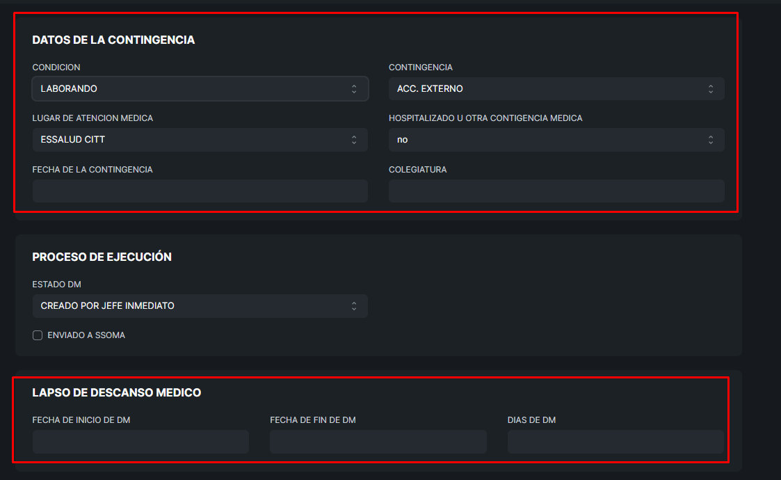 SE RELLENA LA INFORMACION SOLICITADA, DESDE LA CONDICION, CONTINGENCIA, PARA INDICAR SI FUE INTERNA O EXTERNA, EL LUGAR DE ATENCION MEDICA Y EL LAPOSO DE DESCANSO MEDICO.