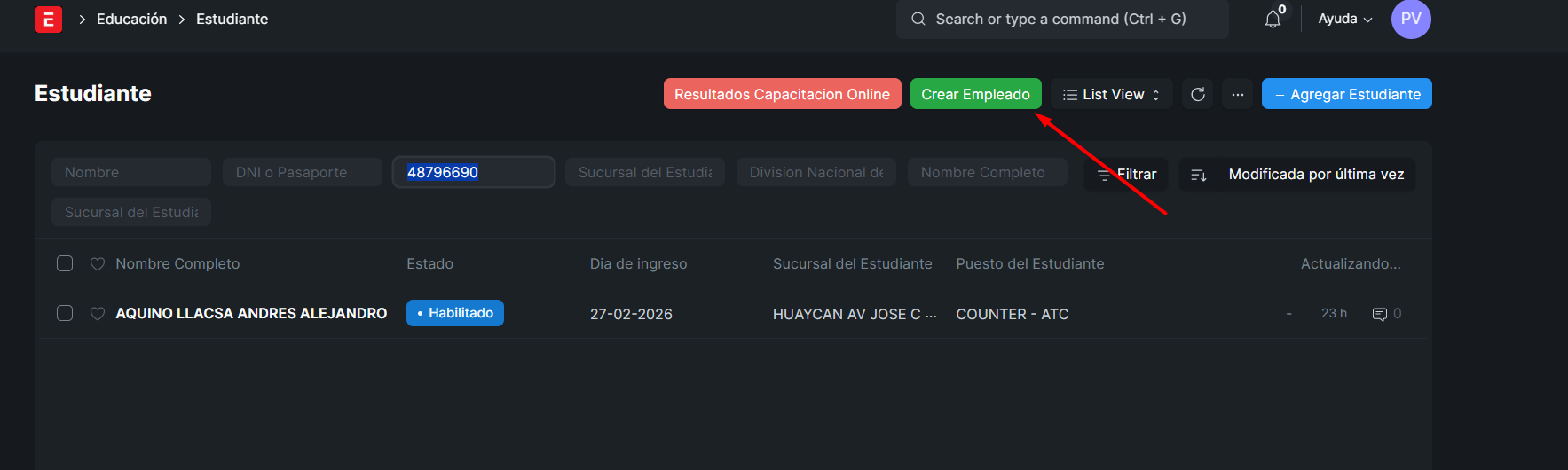 SE CREARA EN PENDIENTE DE ENTREVISTA Y CUANDO SE PASE A CONTRATADO RECIEN SE HABILITARA EL ESTUDIANTE