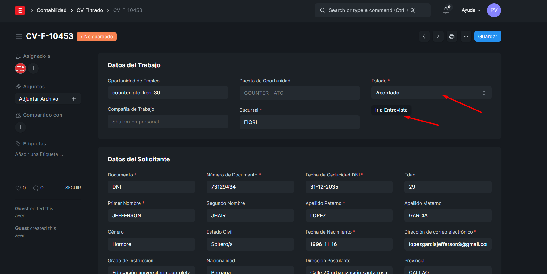 CUANDO EL CV FILTRADO ESTE EN ACEPTADO, RECIEN SE HABILITARA LA ENTREVISTA