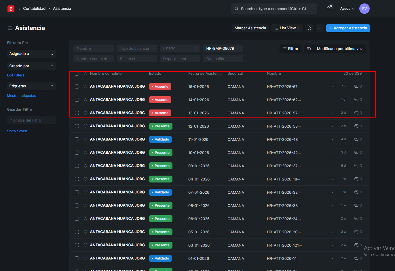 PODREMOS VER SU ASISTENCIA DE MANERA GENERAL EN EL BOTON DE ASISTENCIAS Y SUS MARCACIONES EN EL BOTON DE REGISTRO DE EMPLEADO