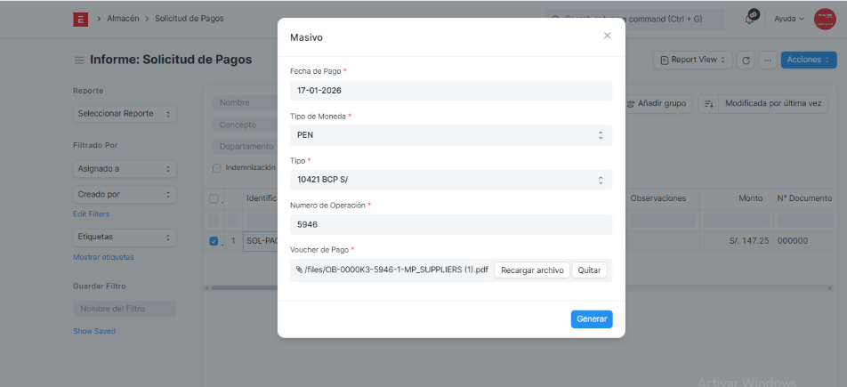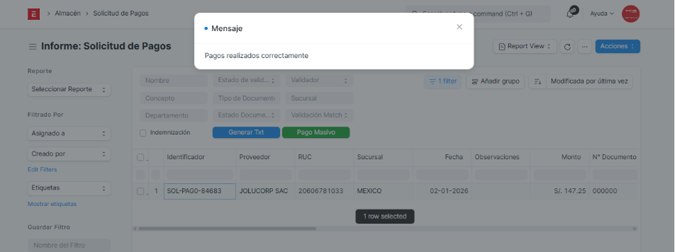 Al realizar un pago masivo en el apartado de Solicitud de Pagos: