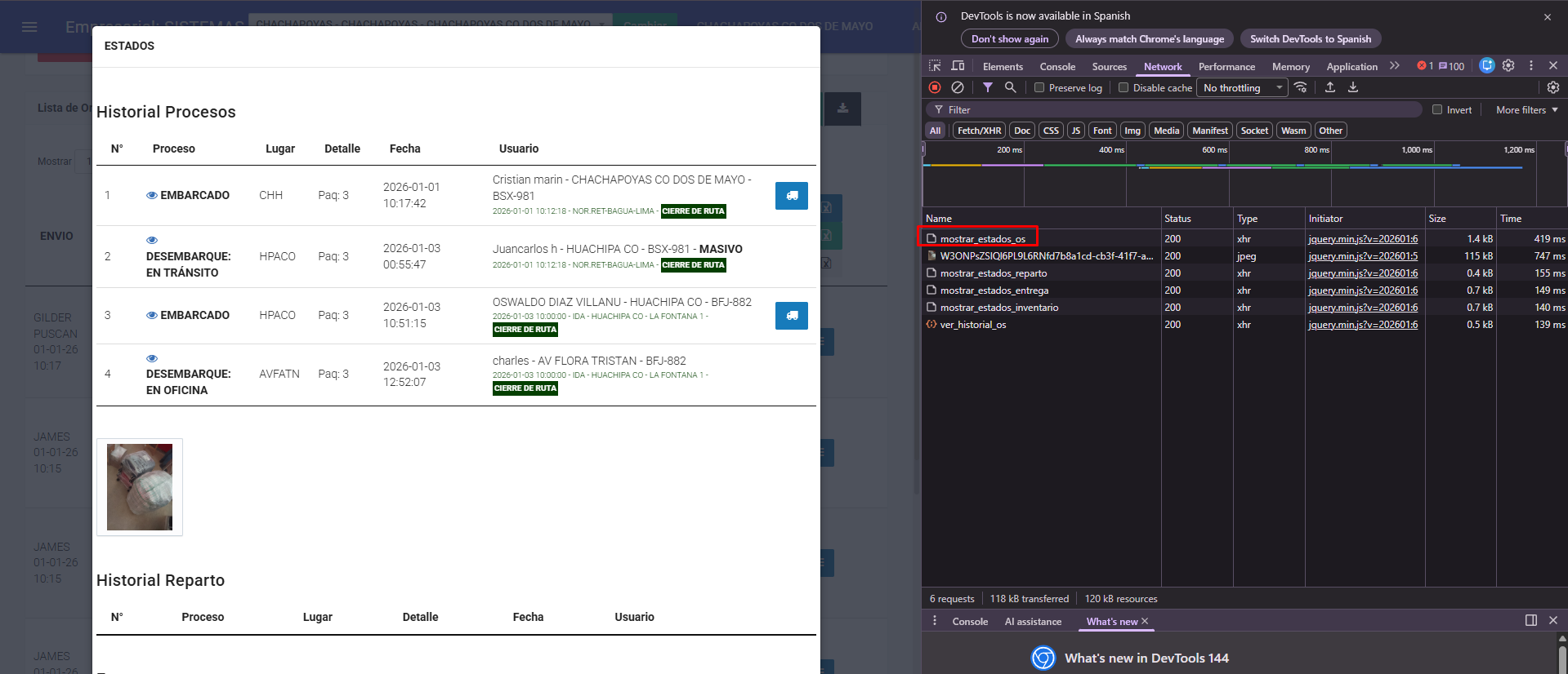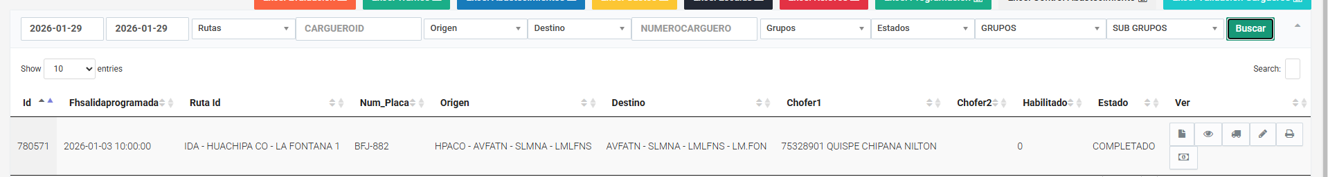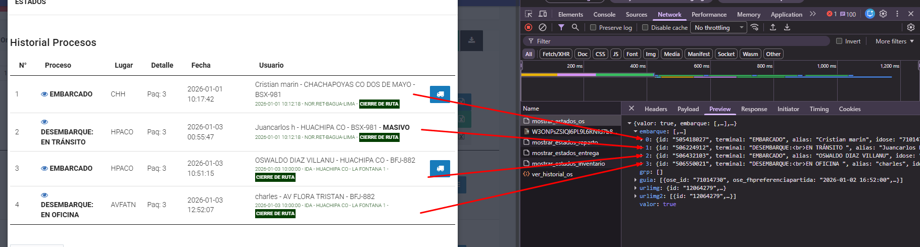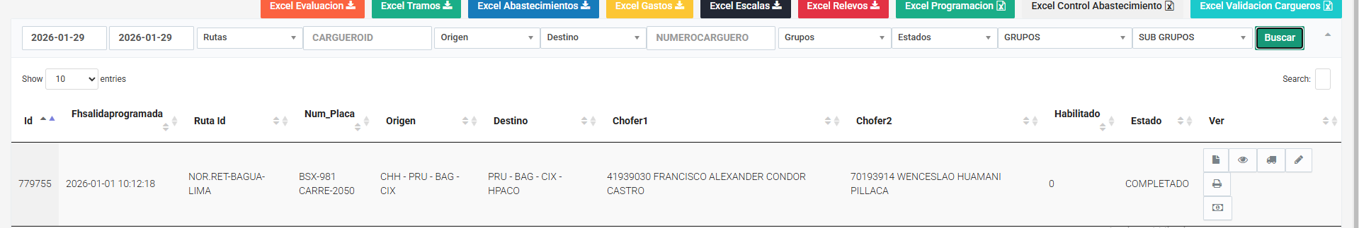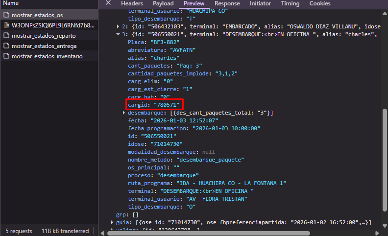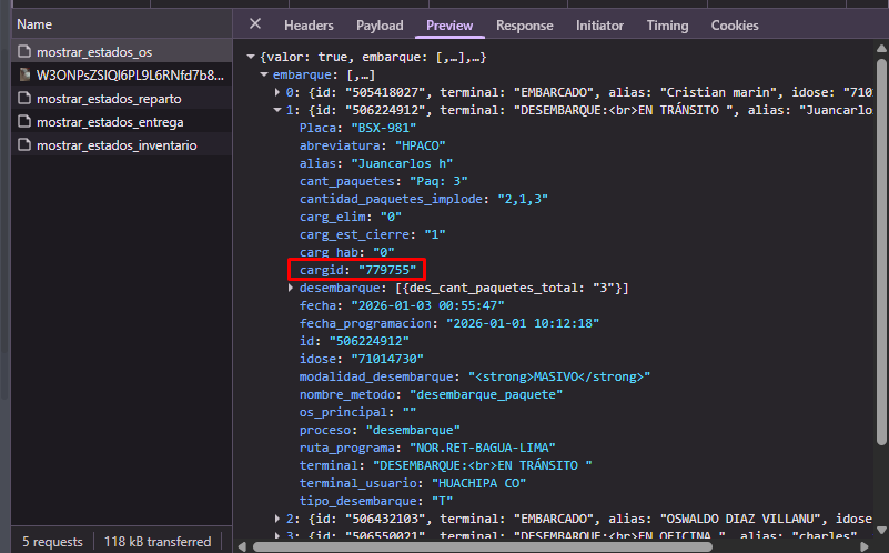 Los IDCARGUERO de las rutas se encuentran en los Desembarques, linea 1 y 3 en la consola, verificamos: