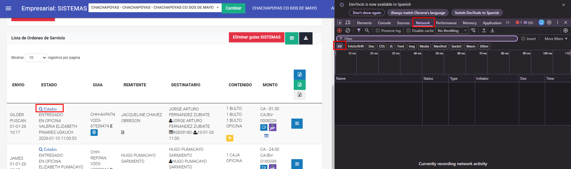 Ingresamos al apartado de Network luego al apartado de Estados de la guia: