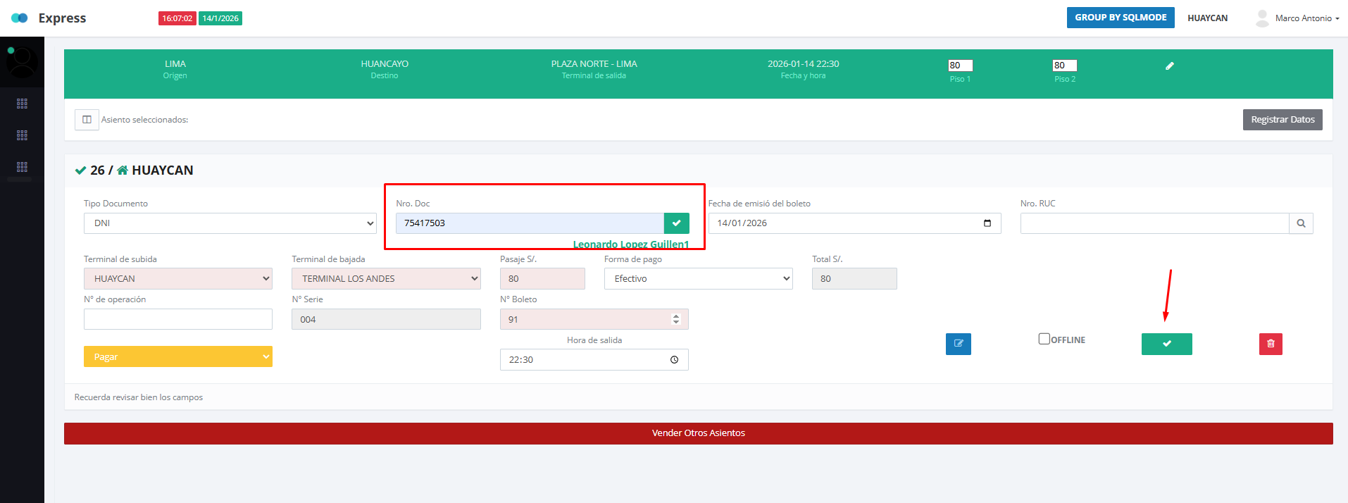 Luego de rellenar el numero de documento, le podemos dar al check verde para que se proceda la venta: