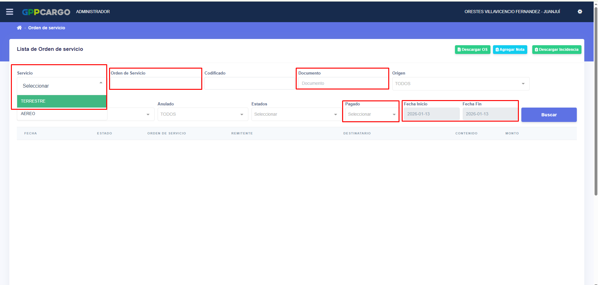 - Filtramos por el servicio indicado por los compañeros de GPP, si fue por TERRESTRE o AEREO