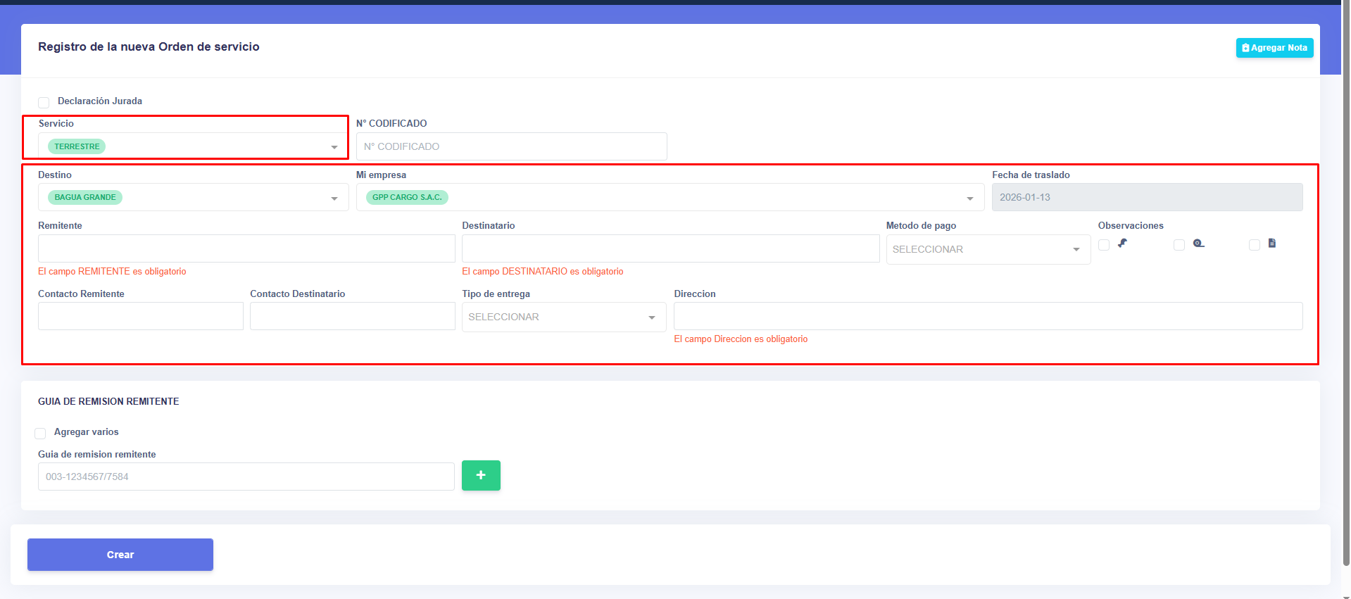 ORDEN DE SERVICIO: En este apartado podremos generar guias, tanto por servicio TERRESTRE o AEREO.