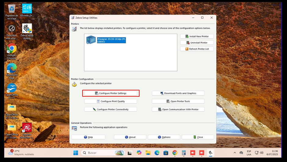 PASO 9: Debería reconocerte la impresora, seleccionas la opción Configure Printer Settings
