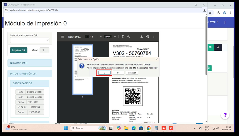 PASO 16: Al querer imprimir un QR, seleccionar sí