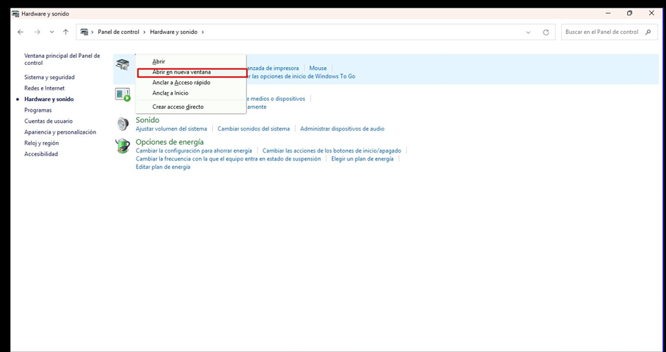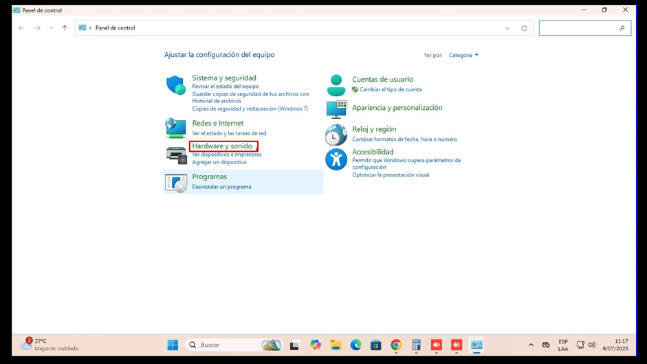 PASO 1: Reconocer la impresora para la instalación de drivers. Ir a Panel de control y seleccionar Hardware y Sonido