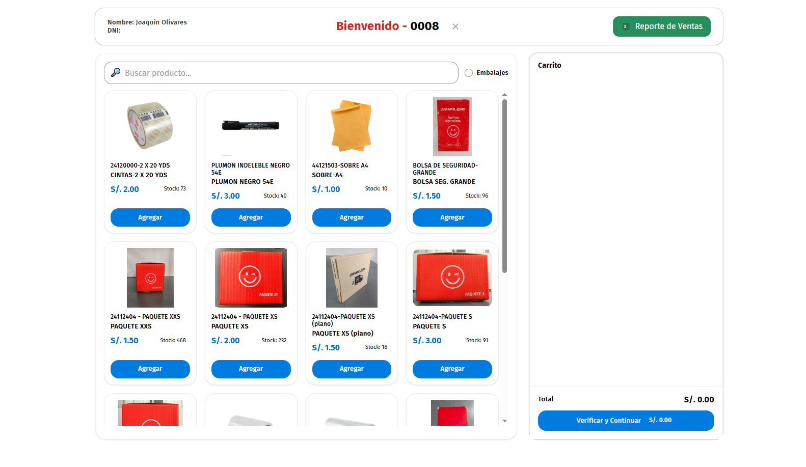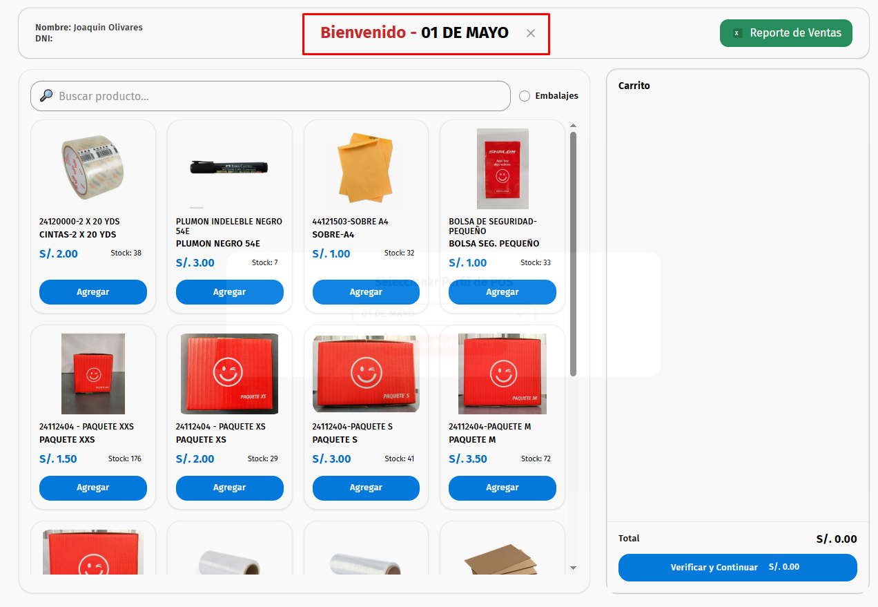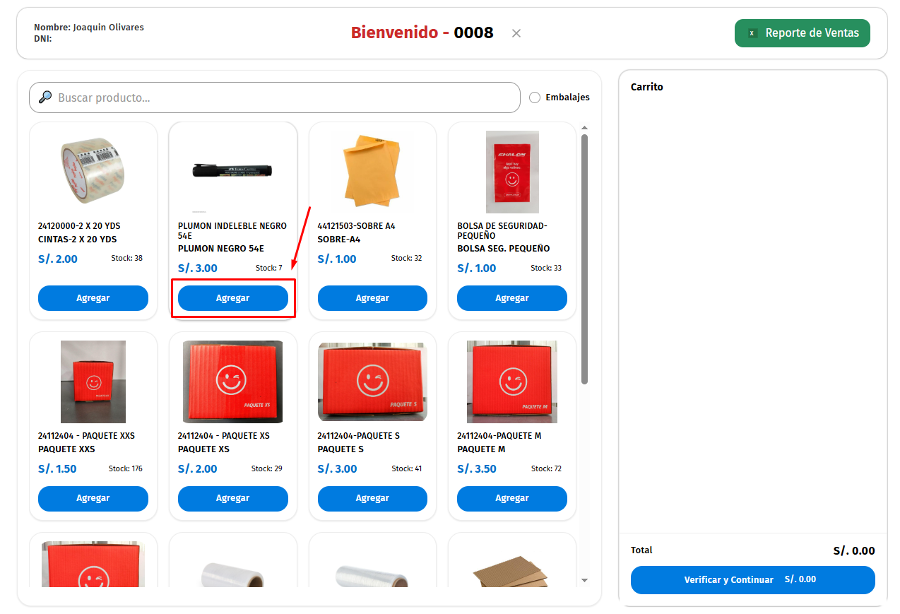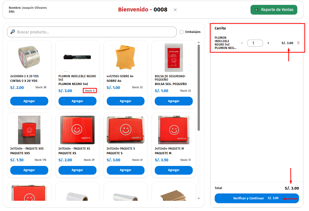 Luego el producto aparecera en la parte derecha y con el precio que figura, ademas de esto el "Stock" debe de restarse segun lo que estemos seleccionando: