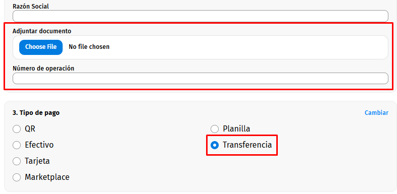 -Tipo "Transferencia", habilita el apartado para adjuntar documento y el número de operación