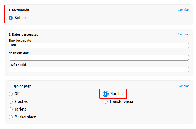 - Tipo "Planilla", solo deja el pago por boleta: