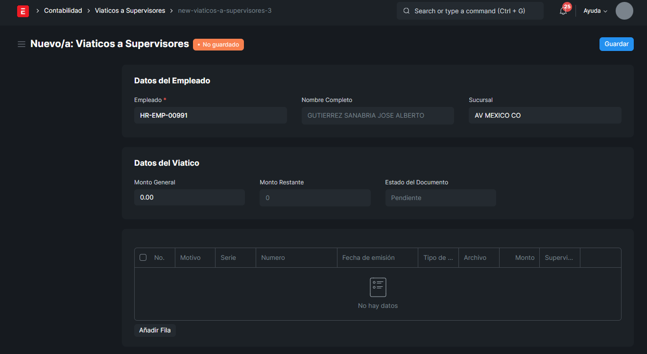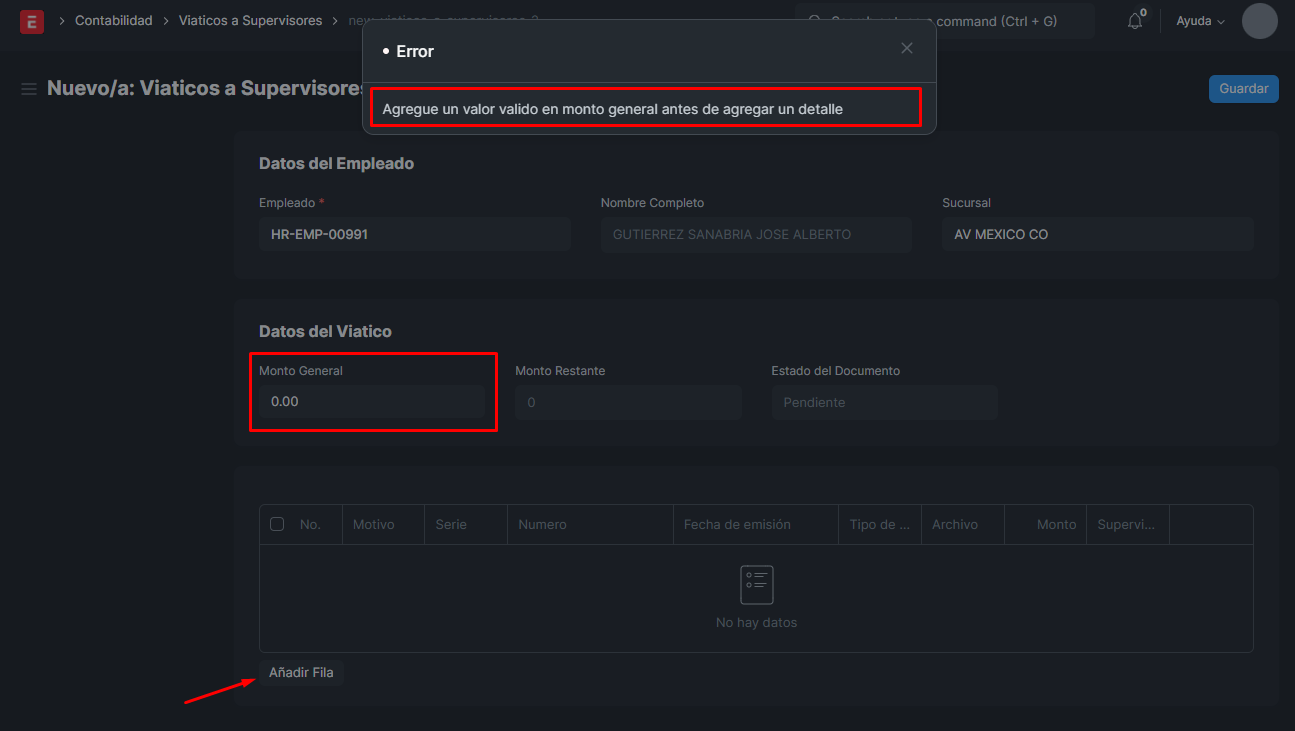 El supervisor desee agregar primero una fila antes de llenar el campo "Monto General"