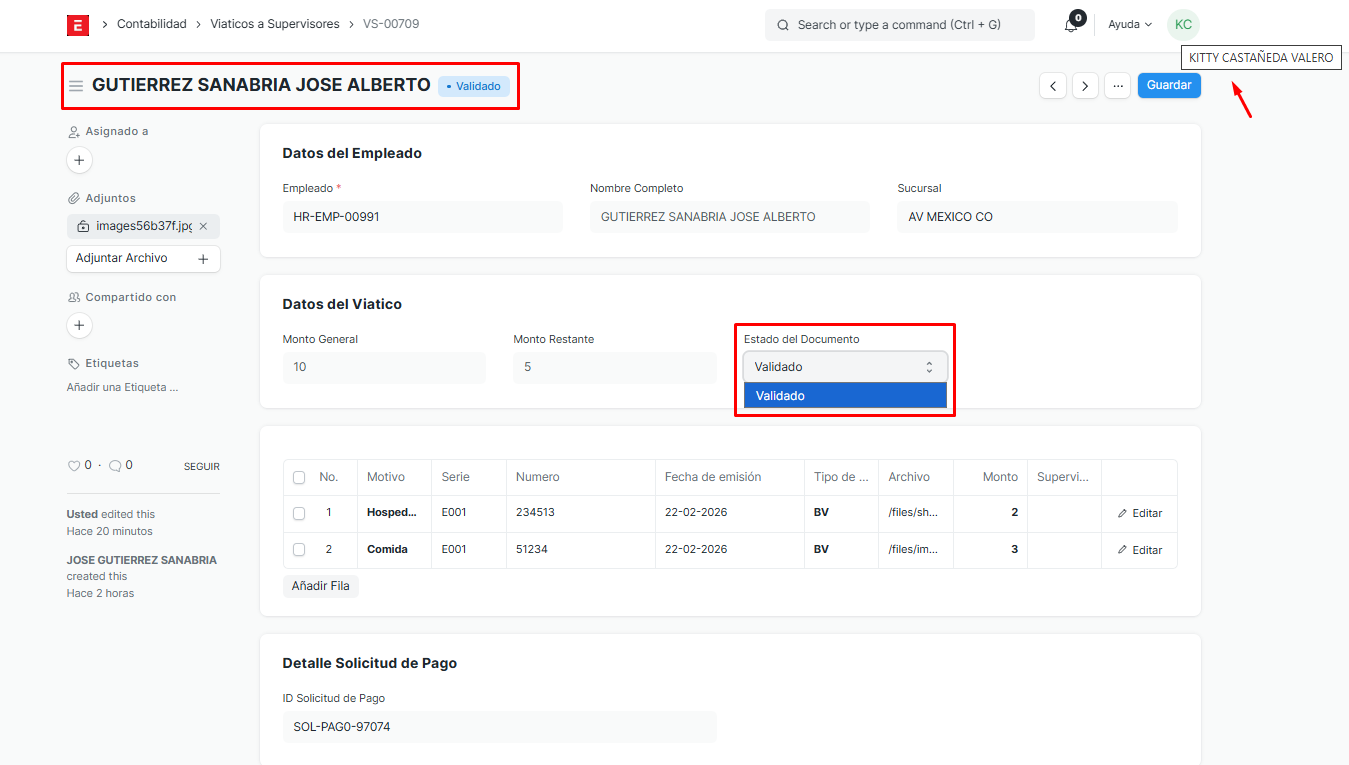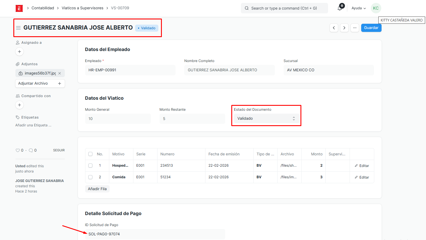 El viático de supervisores y la Solicitud de Pagos quedan vinculados entre sí, con el fin de que tanto el Jefe de Supervisión Nacional como el supervisor tengan visibilidad del registro que será utilizado por el área de Finanzas para realizar el pago.