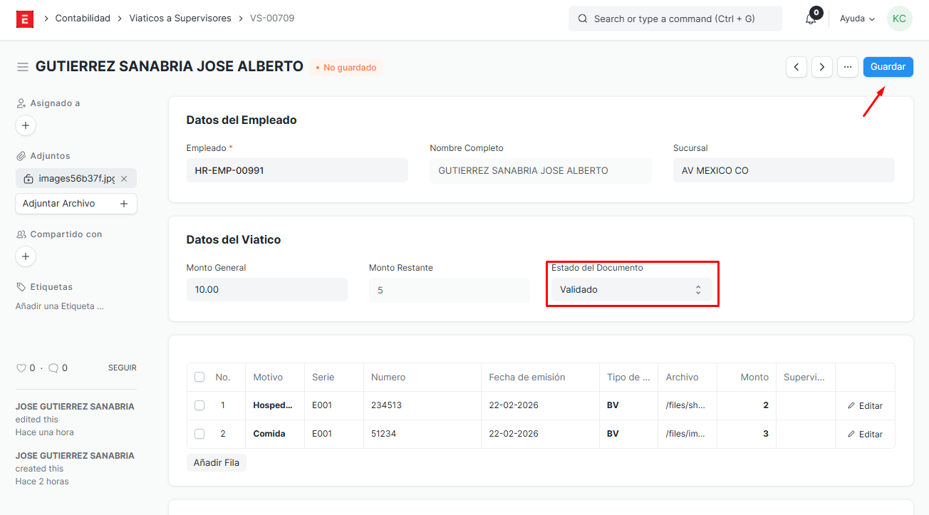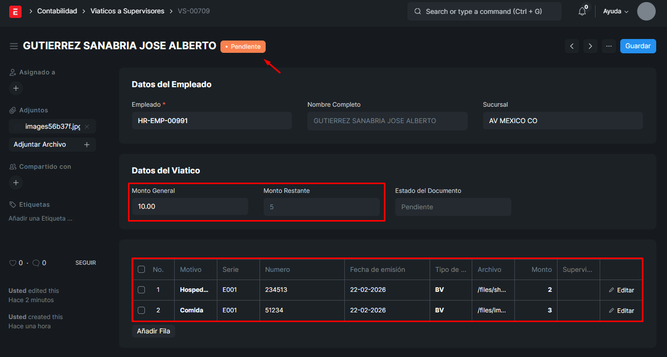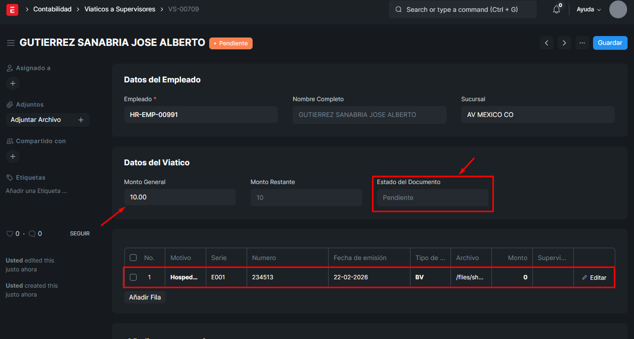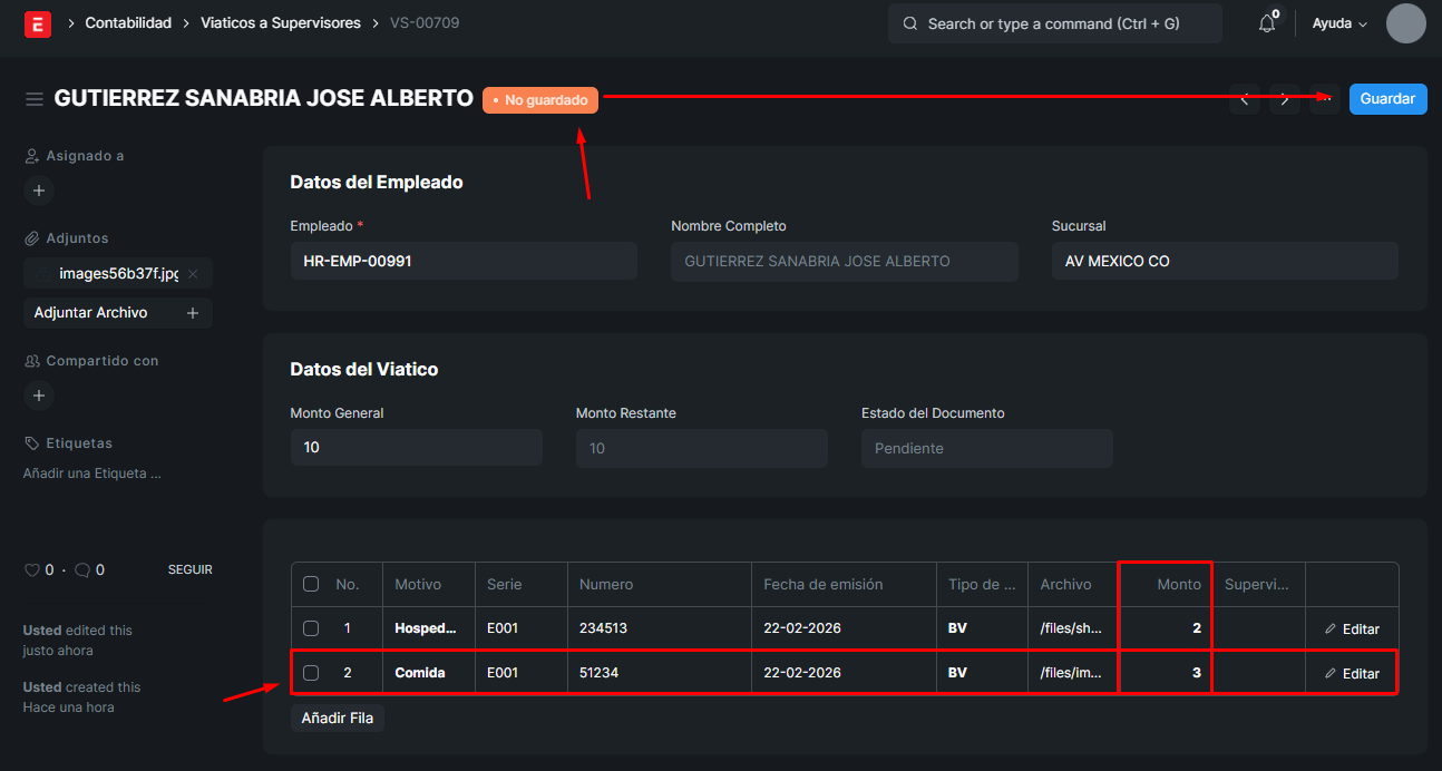 Sin embargo, sí podrá editar la tabla de gastos (agregar o corregir filas) siempre que no exceda el Monto General definido en el viático.
