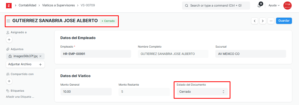 El Encargado del área de Finanzas es el único rol autorizado para cambiar el estado del viático a CERRADO.