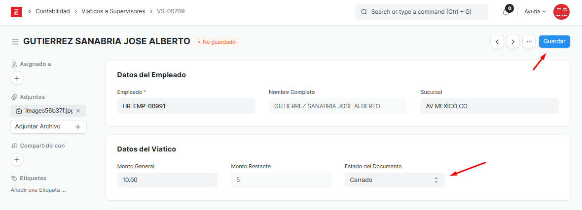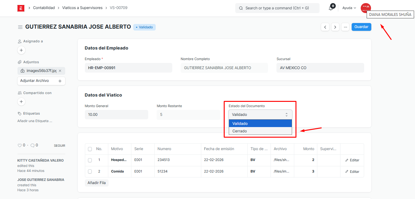 Por su parte, la Jefa de Supervisión Nacional podrá editar el estado del viático, pero únicamente podrá visualizar y mantener el estado en VALIDADO, ya que el estado CERRADO será gestionado exclusivamente por el área de Finanzas.