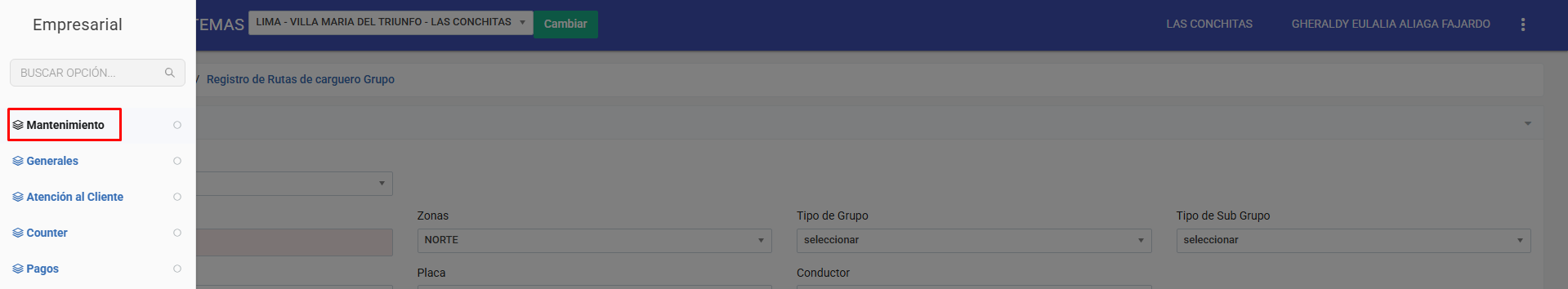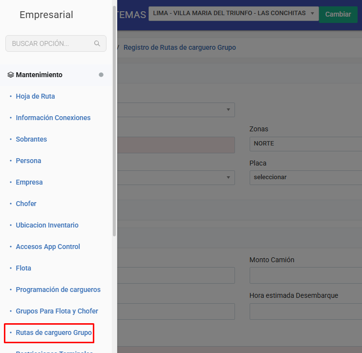 Ingresar al apartado "Rutas de carguero grupo"